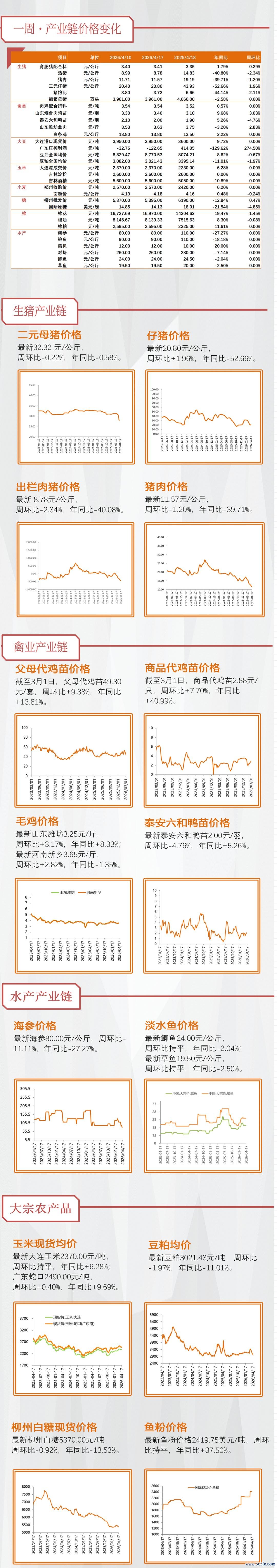 2)养殖端补栏情绪有所改善,种禽企业排苗计划顺畅且苗量略有减少,苗价有试探性上涨的动作。截至4月17日,山东大厂商品代苗报价3.55元/羽(取区间中值),环比+0.10元/羽;山东区域主流毛鸡均价3.60元/斤,环比+0.10元/斤(数据来源:家禽信息PIB)。