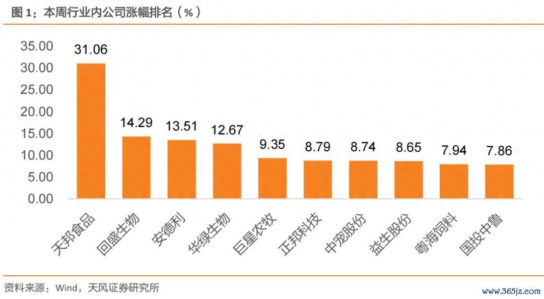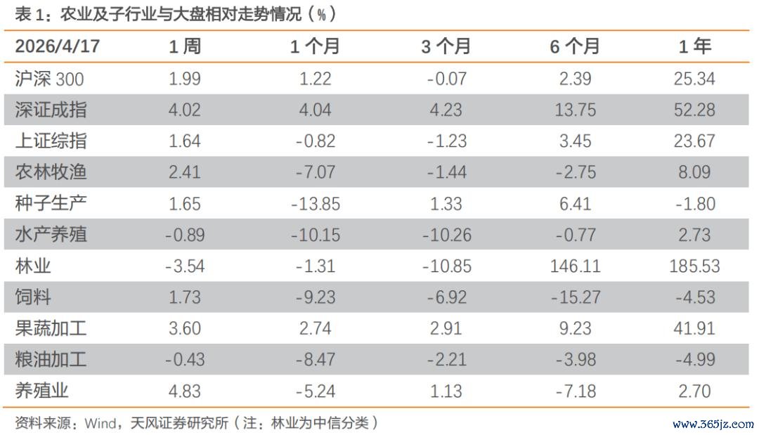 最新交易周(2026年4月13日-2026年4月17日),农林牧渔行业+2.41%,同期上证综指、深证成指、沪深300变动分别为+1.64%、+4.02%、+1.99%。个股中涨幅靠前的分别为:天邦食品+31.06%,回盛生物+14.29%,安德利+13.51%,华绿生物+12.67%,巨星农牧+9.35%,正邦科技+8.79%,中宠股份+8.74%,益生股份+8.65%,粤海饲料+7.94%,国投中鲁+7.86%。