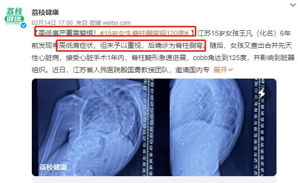 15 岁女孩脊柱弯曲 125 度,严重影响心肺▲